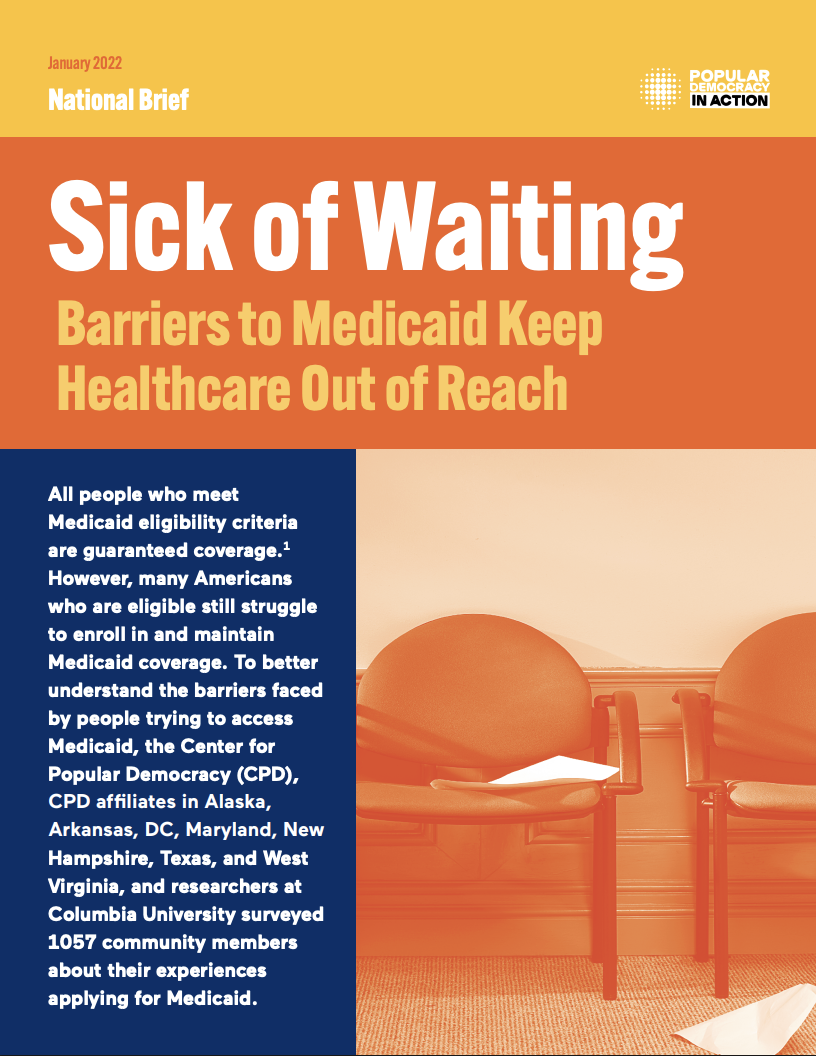 To better understand the barriers faced by people trying to access Medicaid, I worked with the Center for Popular Democracy and community-based organizations in Alaska, Arkansas, DC, Maryland, New Hampshire, Texas, and West Virginia to survey over 1,000 community members across the country about their experiences applying for Medicaid. We found widespread administrative and system barriers–such as long wait times, unhelpful representatives, calls being dropped, and feeling shame or stigma.